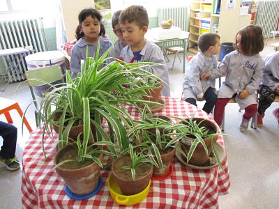 Tenim una planta Chlorophytum, vulgarment anomenada cintes,a la classe que el curs passat va fer molts fillets. Durant l’estiu es van fer grans i aquest any els hem independitzat i ja són 7 noves plantes. Com que la mare segueix fent fillets i a la nostra classe no hi ha més lloc ens agradaria omplir