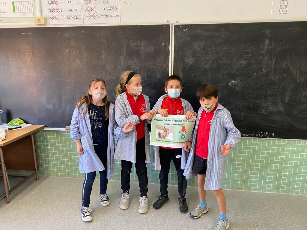 Al llarg de la setmana passada els nens de 4t van anar a les diferents classes de cicle superior. Ens van explicar què havíem de fer si se’ns gasten els retoladors o bolígrafs. Cada classe hauria de tenir un contenidor per guardar-los i quan el tinguéssim ple, baixar-lo a objectes perduts on hi ha la capsa on haurem d’anar deixant els retoladors i bolis. Gràcies per la vostra informació, ho heu fet molt bé i a partir d’ara també ho reciclarem.