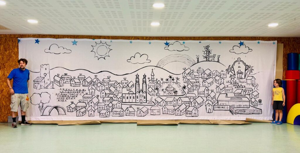 Tota l’escola vol agraïr al Jordi Inglada (pare del Jon de 1r) per haver-nos dibuixat el mural que decora el gimnàs. Va tenir un ajudant excel·lent!