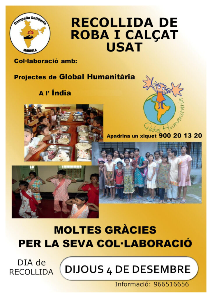 Benvolgudes famílies, Ens complau informar-vos que l’escola participarà en la campanya solidària de recollida de roba i calçat usat en benefici de l’ONG “Global Humanitària” (n. de registre 585703), que desenvolupa projectes humanitaris a l’Índia i Guatemala. La campanya està organitzada per Mariola Solidaria, que s’encarrega també de la gestió de tot el material recollit