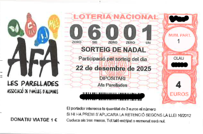 Benvolgudes famílies, ja podeu comprar a l’alumnat de sisè o bé a secretaria, les participacions de loteria del SORTEIG DE NADAL. Cada participació té un preu de 4€ (1€ de donatiu i 3€ de participació). Tot el recaptat anirà destinat al viatge de final de curs de l’alumnat de sisè. Molta sort!!