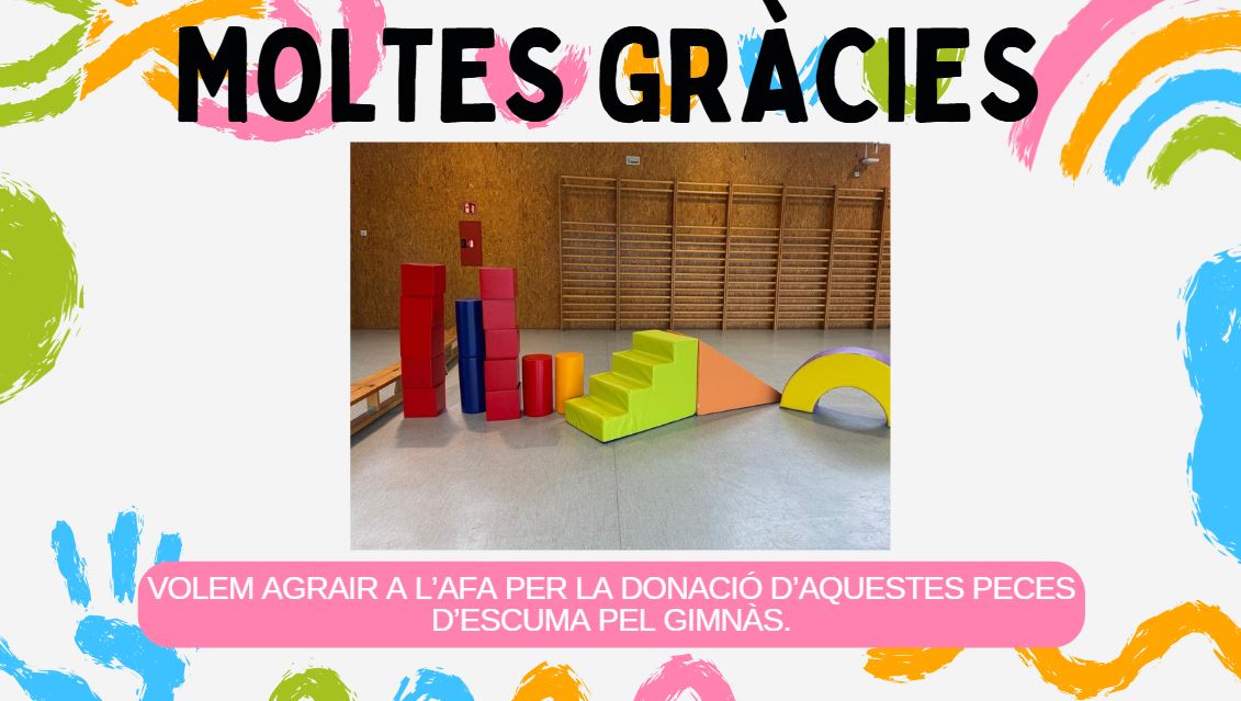 GRÀCIES AFA! Feu un comentari / Per admin / 7 de novembre de 2024 / AFA General Portada L’AFA ens ha fet donació d’aquestes peces de psicomotricitat pel gimnàs de l’escola. Seguiu la feina que fa l’AFA al seu INSTAGRAM!!