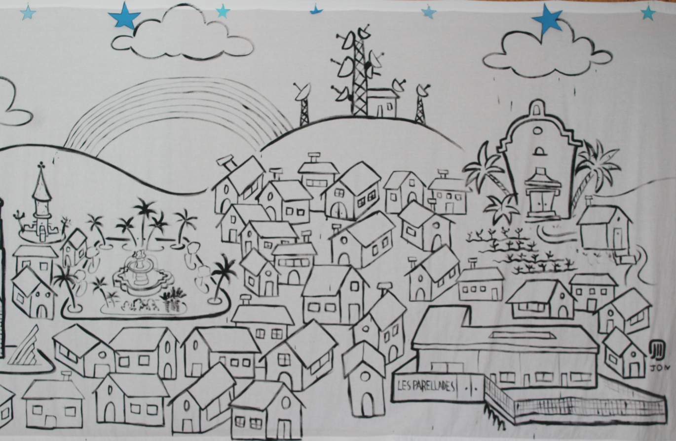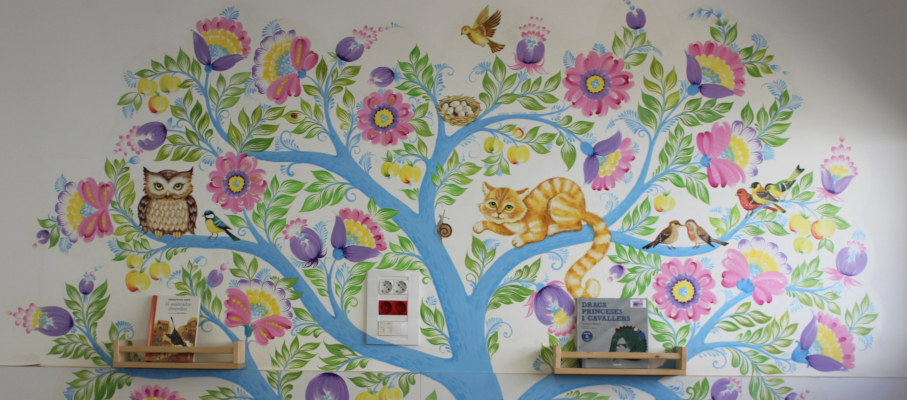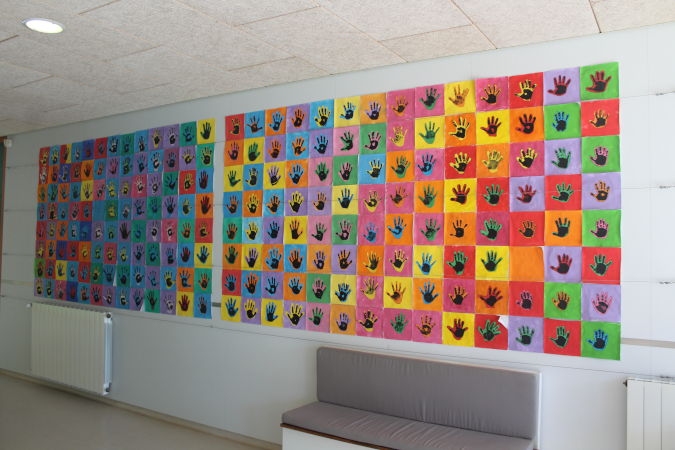Tota l’escola vol agraïr al Jordi Inglada (pare del Jon de 1r) per haver-nos dibuixat el mural que decora el gimnàs. Va tenir un ajudant excel·lent!