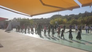 A la tarda ens ajuntem tots i totes al pati per padrins-madrines i fillols-filloles a menjar castanyes i ballar, encara que hem patit una mica de calor.