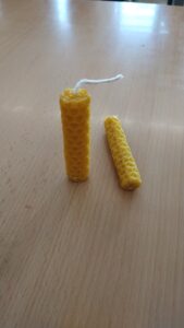 També hem fet un taller d’espelmes. Hem utilitzat cera d’abella i cordill. Espelmes com aquestes, les utilitzaven els normands per il·luminar-se al seu poblat.
