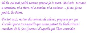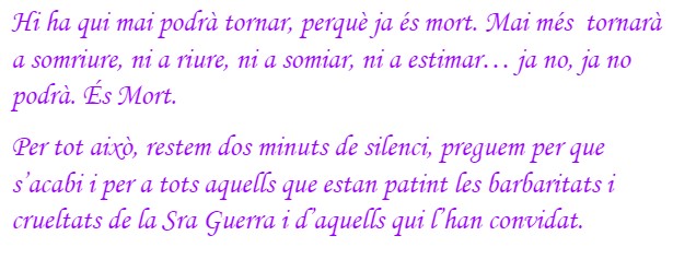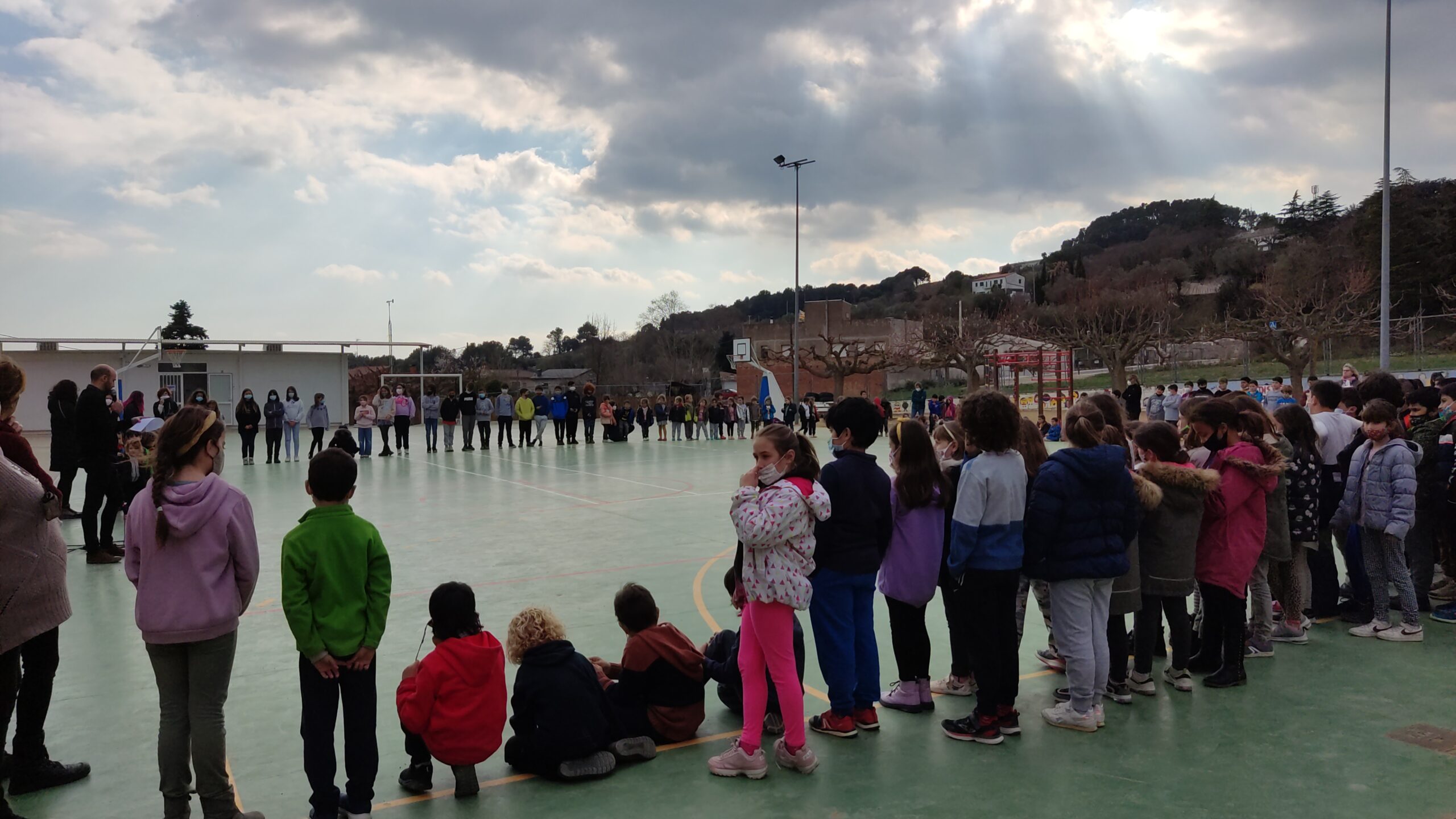 Per aquest motiu, ens ajuntem al pati per llegir un manifest i fer un minut de silenci per recolzar a les persones que estan patint. Tots junts donem importància al treball de valors a l’escola tots el dies i la necessitat de reforçar-los en situacions tan delicades com la que s’està vivint per fer entendre als nens i nenes la importància del respecte, la tolerància i la pau”.