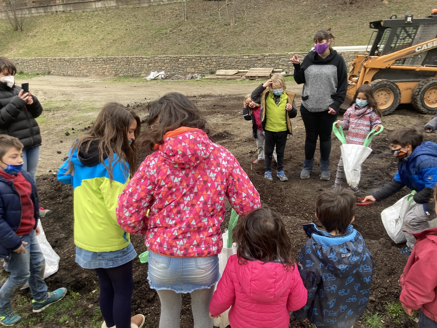 Per començar, ens arremanguem i amb pales i rasclets que ens van dur els Reis Mags preparem la terra: traiem les pedres grans i les males herbes i removem la terra.