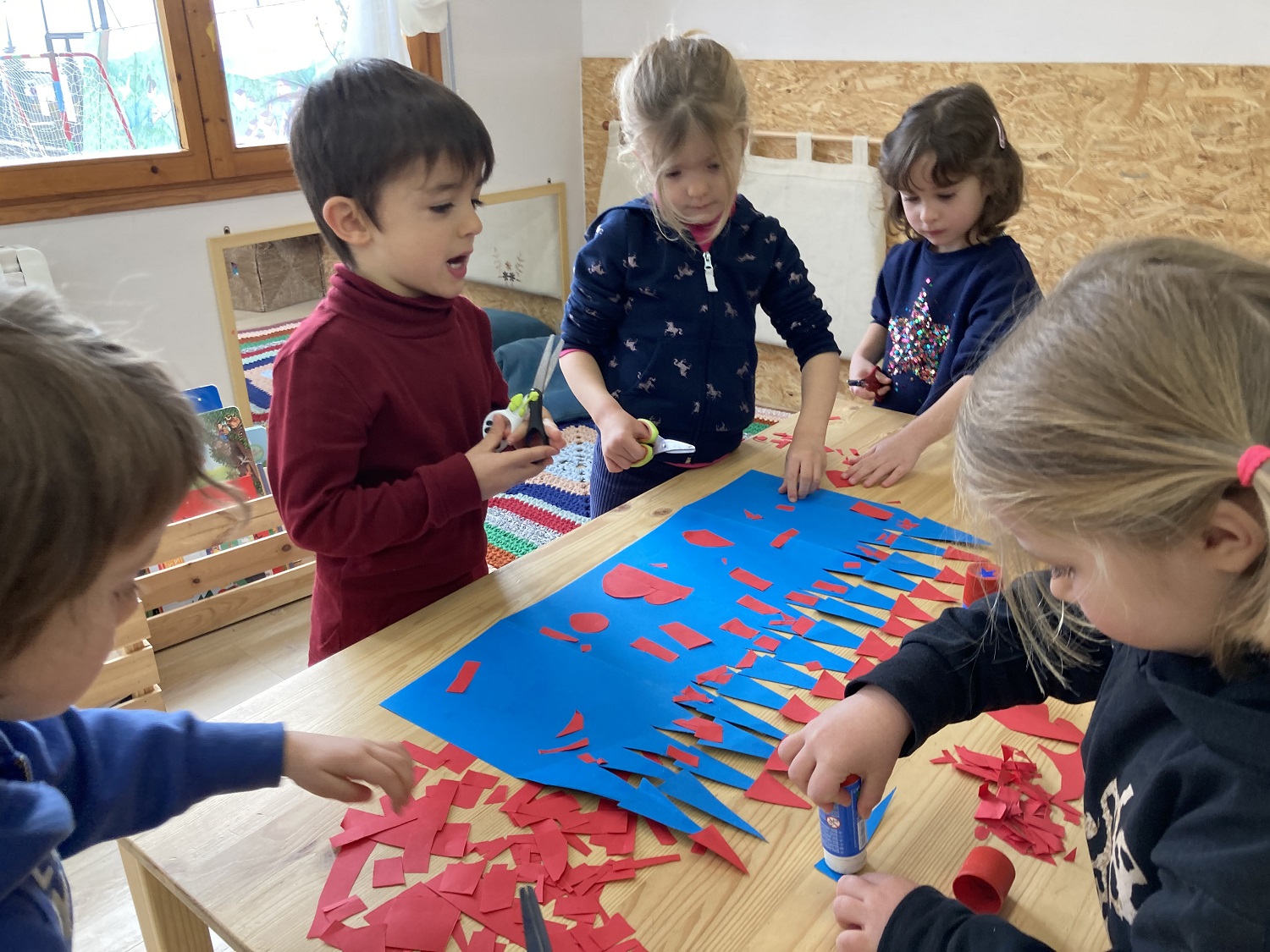 També que volia que fos de color vermell i blau. I amb retalls, hi va fer el seu nom.