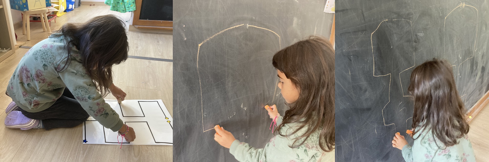 També hem treballat el traç en una escala més concisa, però fent treballar les dues mans alhora. Ens ha agradat molt! Amb uns taps de suro havíem de fer el traç ben concentrats i després dibuixar-lo a la pissarra. Els nens i nenes dels Petits estan aprenent molt!!