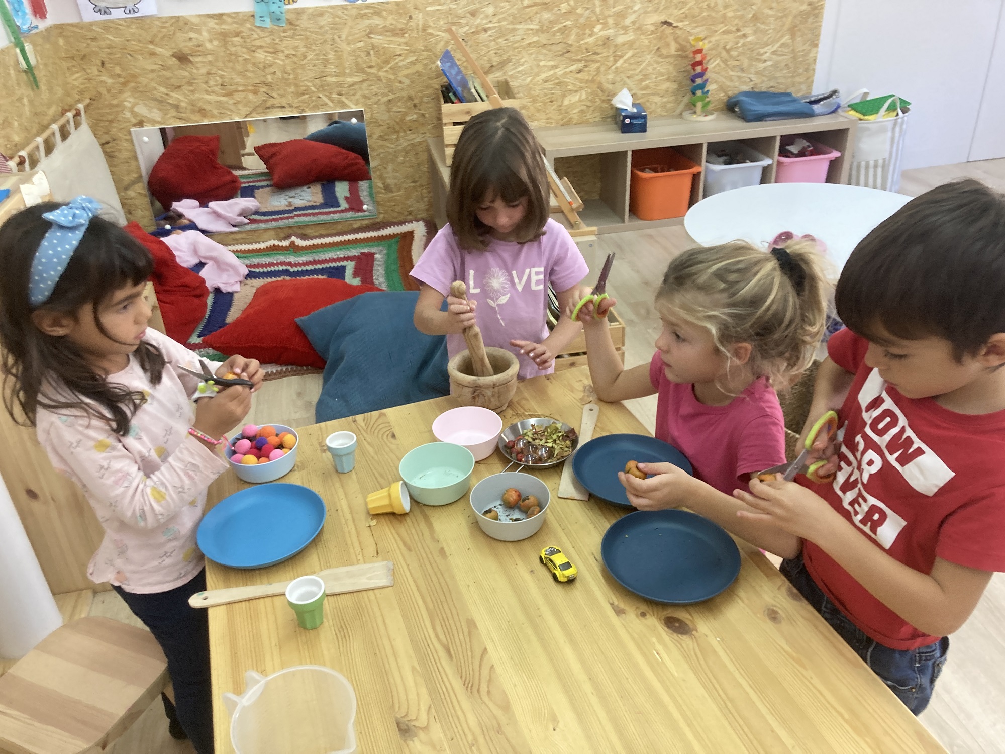 A l’aula passem moltes estones fent joc simbòlic, tant a l’obrador, que aquesta setmana tenia més coses de la tardor: fulles, herba, tapaculs, pinyes… i tot manipulant-ho, els nens i les nenes reforcen la seva motricitat fina, coordinació i simbolisme.