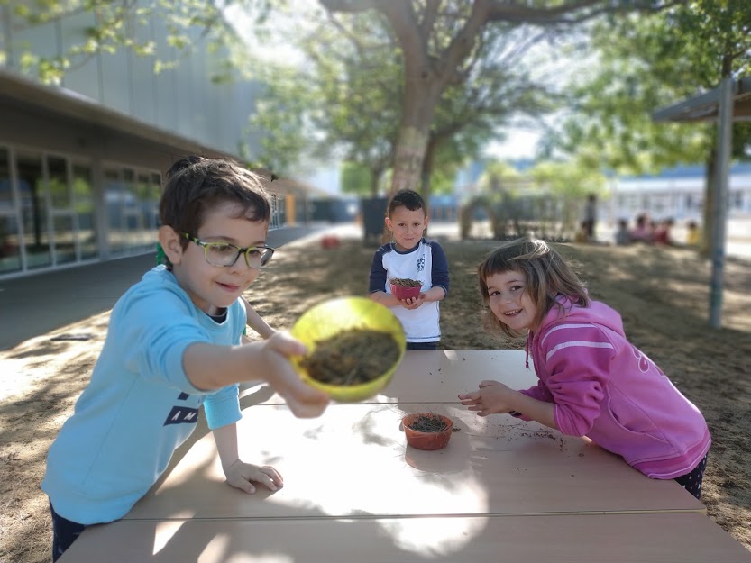A partir d’aquest niu vam voler fer d’ocells i intentar crear el nostre propi niu. Per poder fer-ho vam agafar un recipient de plàstic i vam sortir al pati a buscar materials naturals. En Genís ens va mullar el pati per tal de poder fer fang amb sorra fina i aigua.