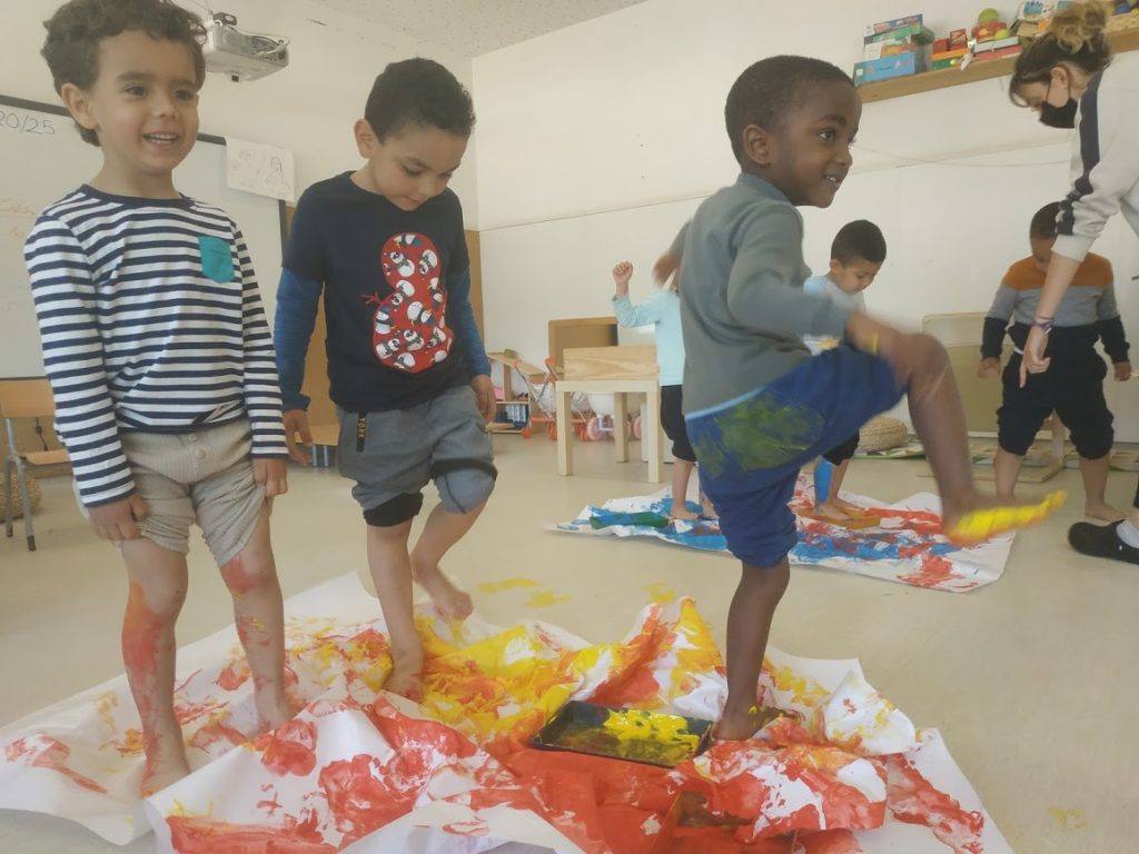 Quan van veure que ho faríem amb els peus algun nen i nena es va fer enrere per uns segons, però de seguida, veient als altres companys/es es van engrescar.  Al primer mig grup no vam posar la bata, vaig pensar que si pintàvem amb els peus no feia falta. Però amb l’experiència del primer grup, caigudes de cul i patinades, el segon grup si que la van utilitzar i tot va anar millor.