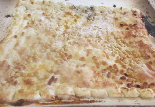 Una mica de llardons esmicolats amb els dits, uns quants pinyons, sucre i esquitxar una mica amb l’ou. Sense l’ajuda de les cuineres de l’escola que ens la van enfornar i la van deixar al punt no ho haguéssim pogut fer.