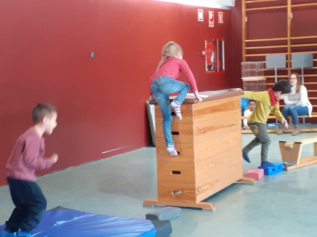 Han desenvolupat destresses bàsiques saltar a dos peus, peu coix, arrossegar-se, trepar, fer tumbarelles i l’equilibri amb diferents circuits d’activitats. També han fet reconeixement de les diferents parts del cos coordinant gest i ritme mitjançant cançons.