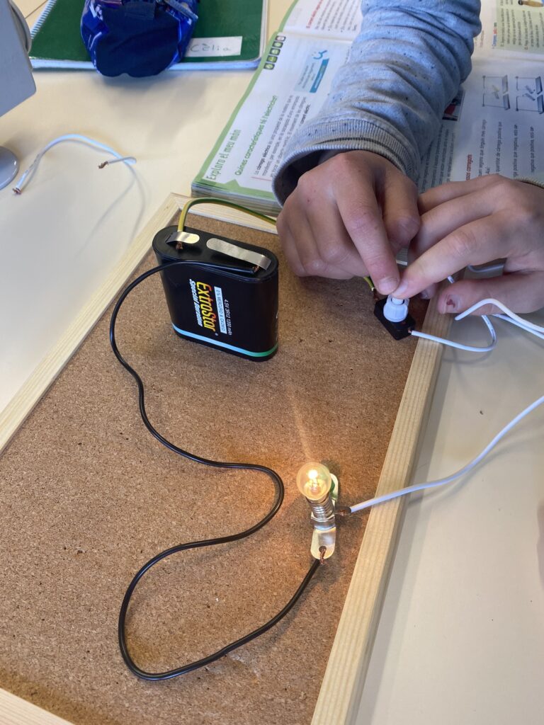 L’alumnat de cinquè hem estat treballant com ens arriba l’energia elèctrica i hem construït un circuit elèctric elemental amb una pila, una bombeta i un interruptor units per cables conductors. Hem observat que hi ha uns materials que deixen passar el corrent a través seu, són els conductors i altres que no el deixen passar, aquests s’anomenen aïllants.