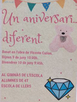 Per fi ha arribat el gran moment de 4t! La representació de l’obra de teatre UN ANIVERSARI… DIFERENT! d’en Vicente Cañón. Hem fet dues sessions, una els dijous 9 de juny pels alumnes de 3r, 4t i 6è i una altra el divendres 10 juny per l’alumnat d’EI i CI.