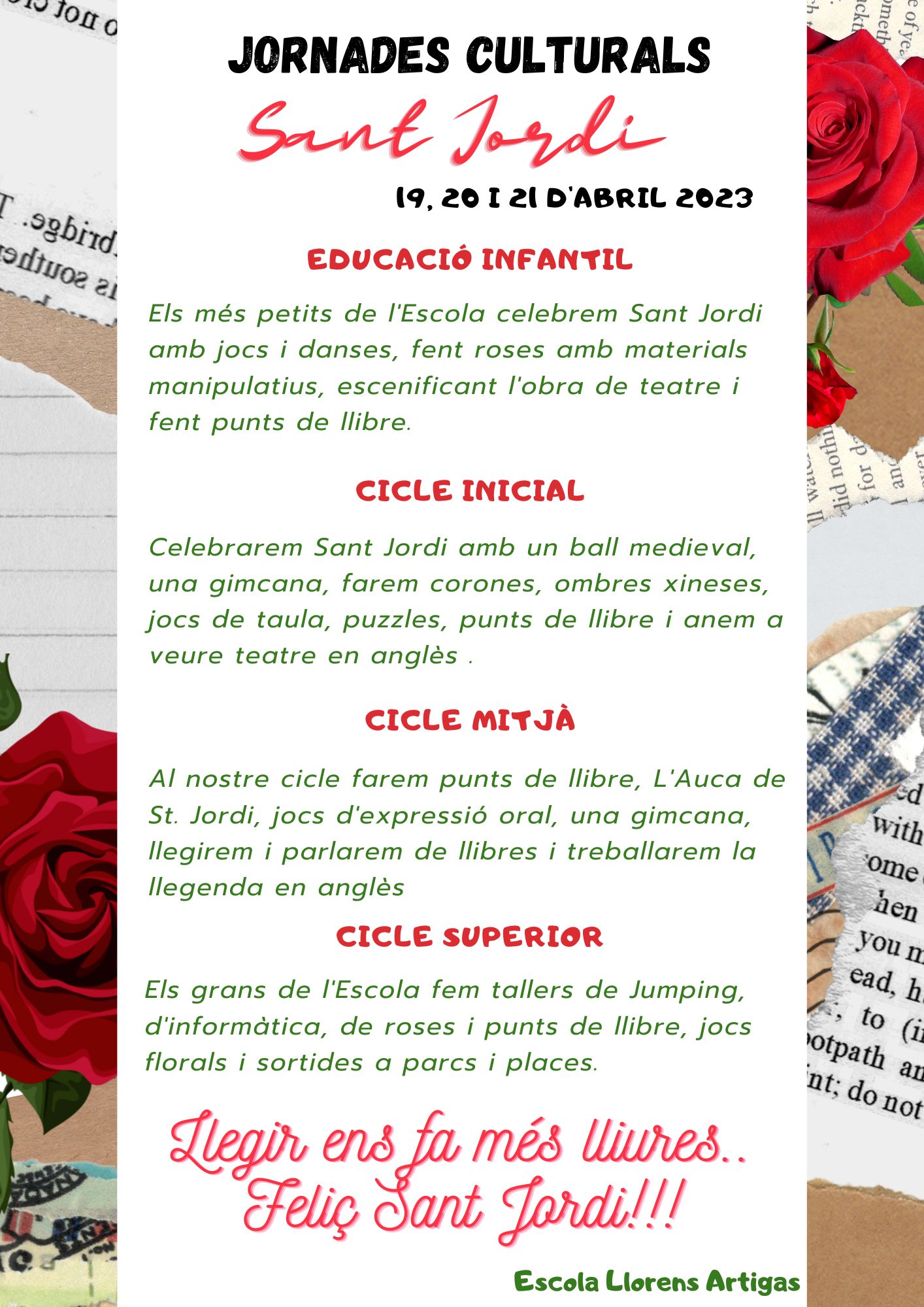 Jornades culturals 2023 admin19/04/23 Arriba Sant Jordi, i amb ell, les tradicionals JORNADES CULTURALS de 2023! Tothom està molt il·lusionat amb la proposta d’activitats que han preparat les mestres! Som-hi!!!
