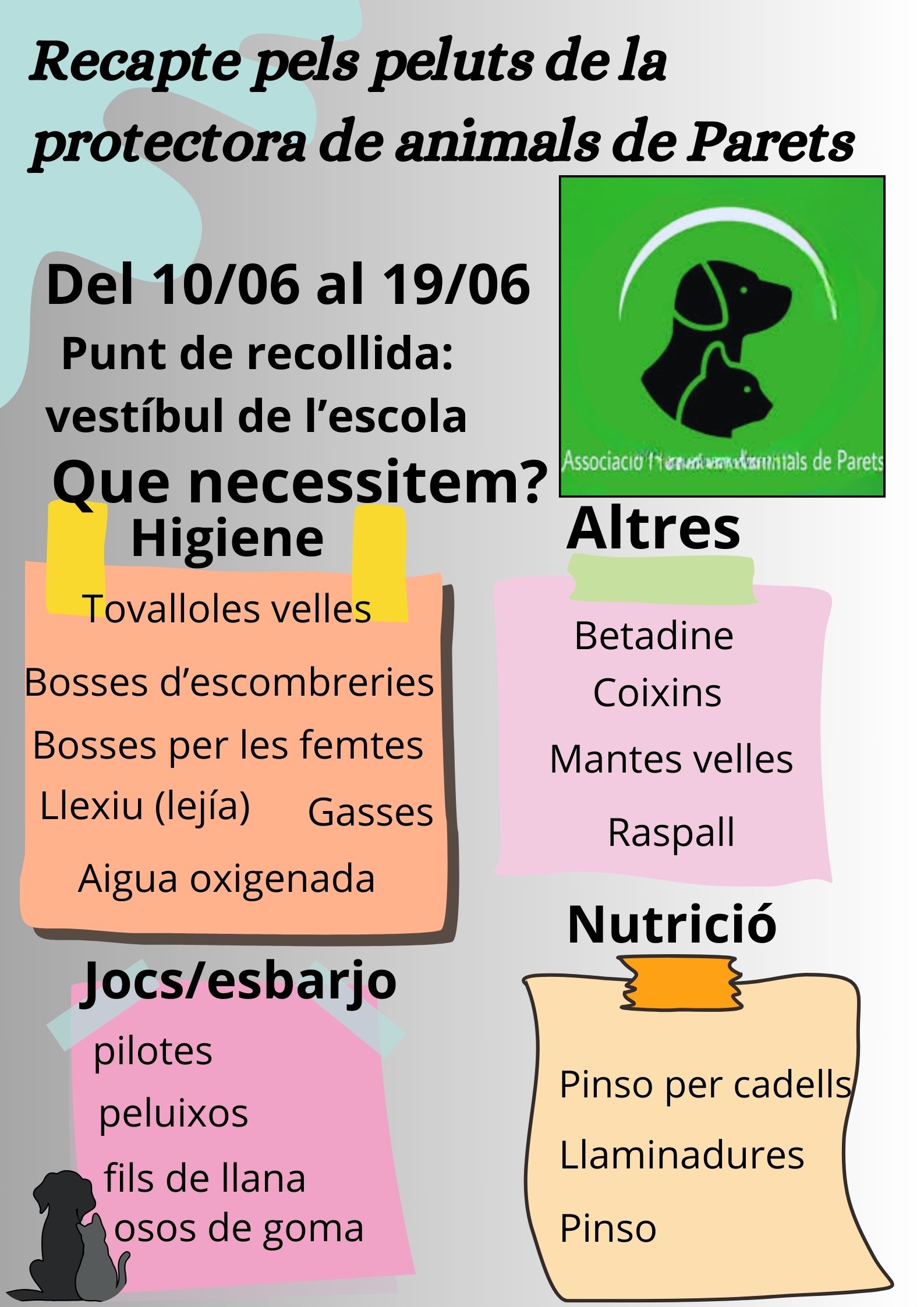 Aquesta recollida, consisteix en aportar diferents coses: des de pinso, llaunes, productes de neteja, sorrals i sorra (se n’utilitza molt) fins a joguines, tovalloles i mantes velles.