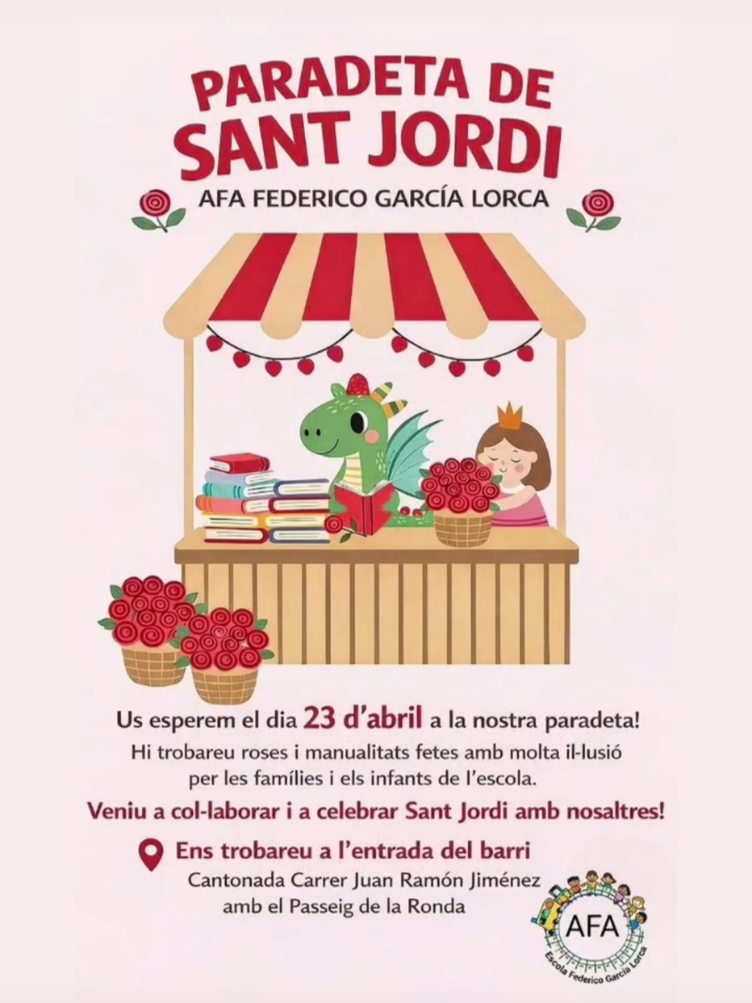 Des de l’AFA us convidem a visitar la nostra paradeta, on trobareu roses i manualitats fetes amb molta il·lusiĂł per les famĂlies i els infants de l’escola. Una oportunitat per celebrar junts aquesta diada tan especial!