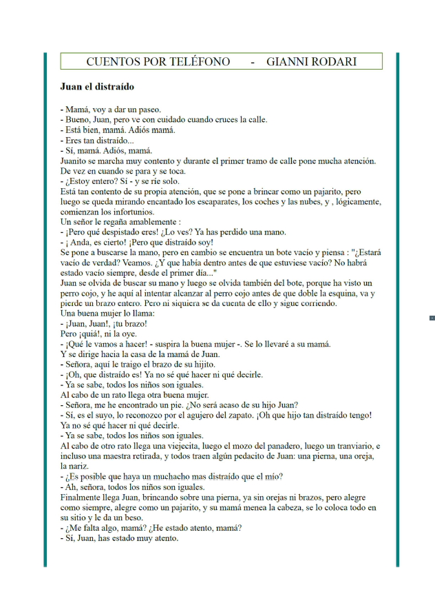 Gianni Rodari fue un escritor italiano especializado en literatura infantil y juvenil. Nuestra propuesta para esta semana es que busques información sobre este autor y escribas una breve biografía (con los datos más destacados de su vida y su obra). Nos envías tu trabajo a acases6@xtec.cat (3ºA) y abertra2@xtec.cat (3ºB) Cuentos por teléfono: JUAN EL DISTRAÍDO En el vídeo se cuenta el cuento JUAN EL DISTRAÍDO. Debajo te compartimos el texto del mismo cuento. Léelo en voz alta a tus familiares (si quieres lo puedes hacer por teléfono). Si puedes gravar un vídeo mientras lees, nos lo puedes enviar por correo. ¡Anímate a leer! |