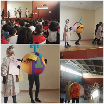 Avui ens hem reunit tots a la sala polivalent perquè ha vingut la Xurripampi a l’escola ben acompanyada dels Dòminos.