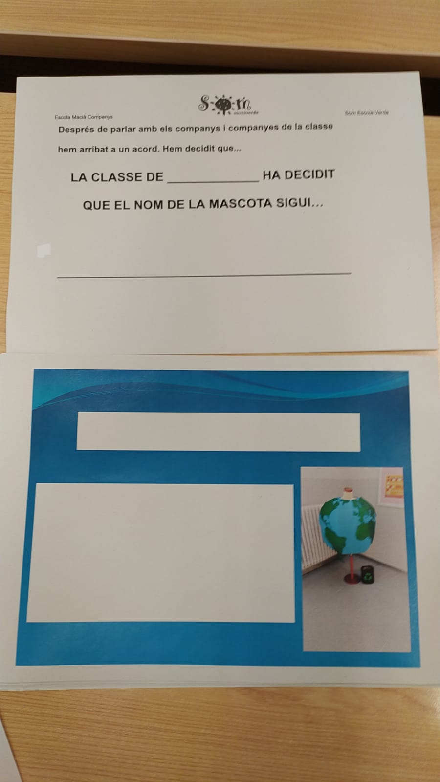 1r. Cada curs va haver de votar un nom per la mascota. Havia de ser un nom pensat amb el disseny de la mascota. Algun nom que tingués relació amb la Terra, el nostre planeta blau. Cada nen/a va pensar un nom i per classes es va votar aquell que agradava més a la majoria.