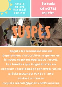 ES SUSPENEN LES JORNADES DE PORTES OBERTES Feu un comentari / Per admin / 12 de març de 2020 / Articles importants ESCOLA General Portada ÚLTIMES NOTÍCIES