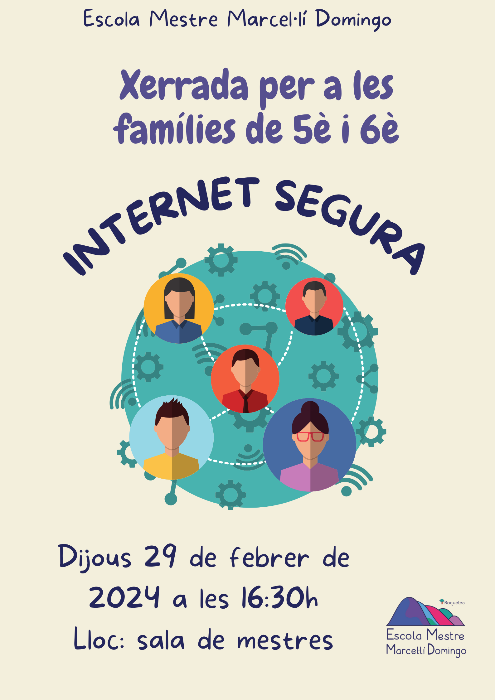 XERRADA “INTERNET SEGURA” PER A LES FAMÍLIES DE 5È I 6È Feu un comentari / Per admin / 20 de febrer de 2024 / Articles importants ESCOLA General Portada Projectes de participació i relació ÚLTIMES NOTÍCIES Us convidem a venir a la xerrada “Internet Segura”, organitzada per l’escola, el dijous 29 de febrer a les 16:30h a la sala de mestres.