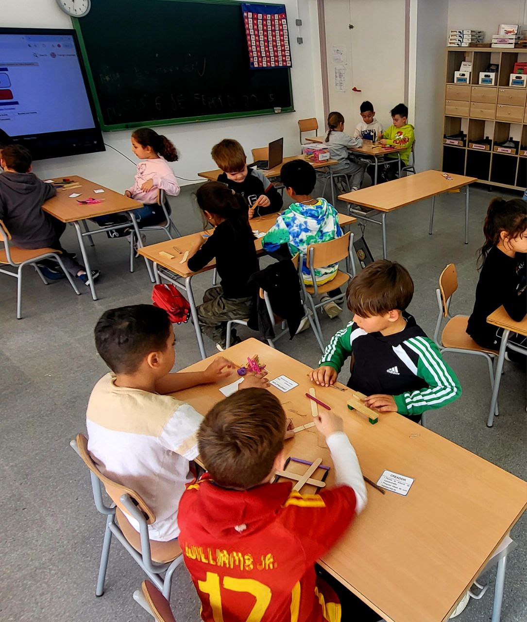 Com els infants de 2n elaboren l’atrezzo de l’obra de teatre de 6è, estan descobrint les diferents propietats dels materials amb l’objectiu de saber triar el més adient segons l’objecte a realitzar.