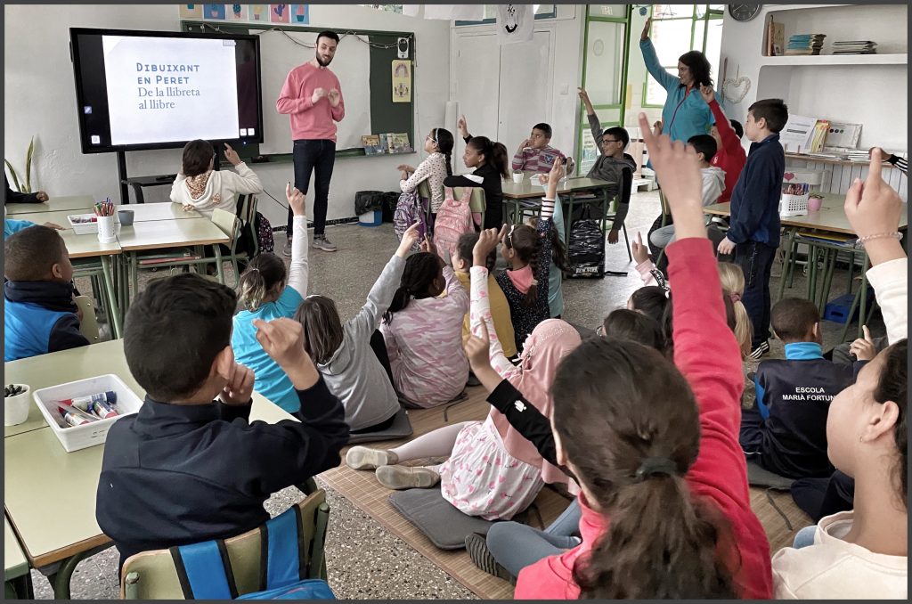 El Marc Díez ens ha desvetllat el seu procés de creació i hem quedat sorpresos de les idees que ens ha donat a l’hora de dibuixar una història. Sabeu que darrere les seves il·lustracions està la Martirio, o el Petete? inclús un sofà va servir d’inspiració d’una casa! Hem pres bona nota de tot i deixarem anar la nostra cretivitat i tot el que ens ha explicat en els nostres dibuixos.