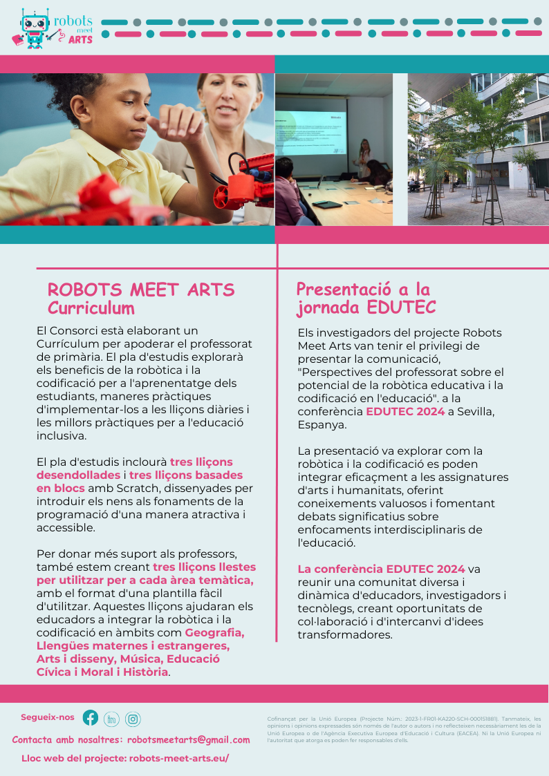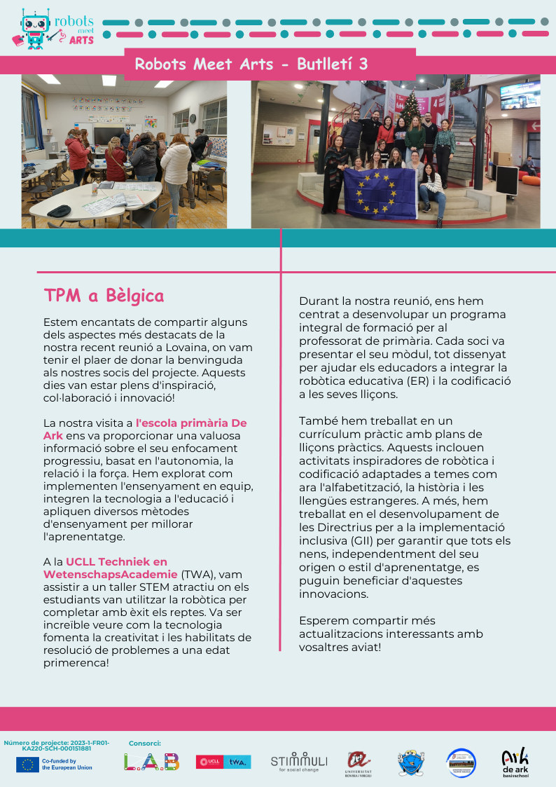 Com ja sabeu, l’escola participa en un projecte Erasmus+ KA220, que té com a objectiu dissenyar un curs de formació pel professorat que vulgui aprendre a treballar el currículum d’Arts i Humanitats mitjançant la robòtica i la codificació, el Projecte Robots meet Arts.. Tot i que la majoria de les reunions es duen a terme per videotrucada, n’hi ha 4 que es fan presencialment, una a cada país que participa en el projecte. La primera fou a casa nostra el curs passat i la segona ha estat a Bèlgica.