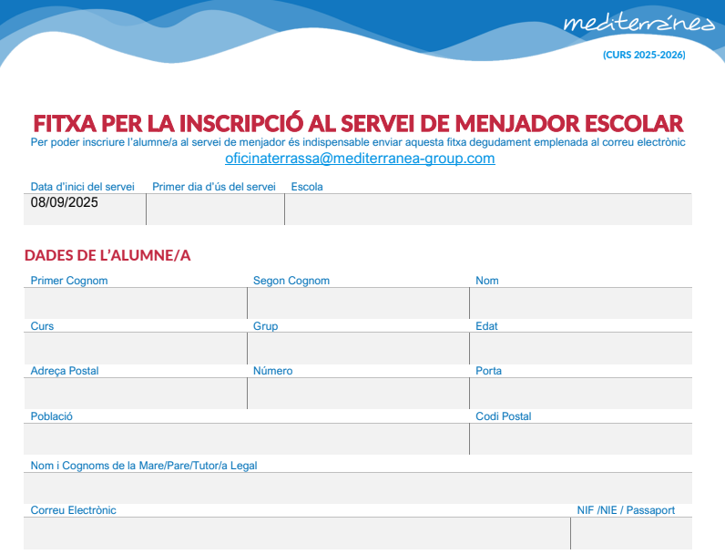 Benvolgudes famílies, Us adjuntem el full d’inscripció per apuntar-se al menjador. Moltes gràcies.