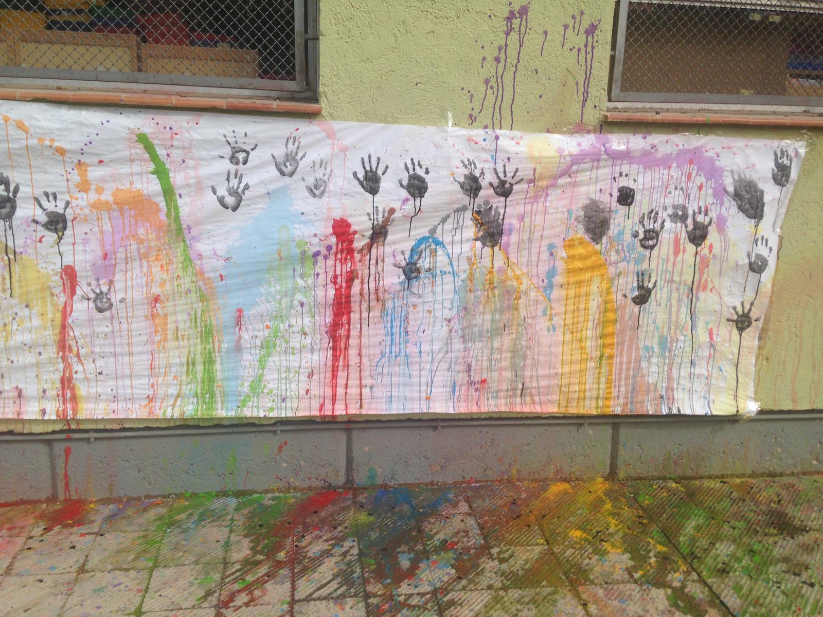 Aquesta setmana hem reaitzat un mural seguint dues tècniques que el emprava: els regalims i l’estampació de mans.