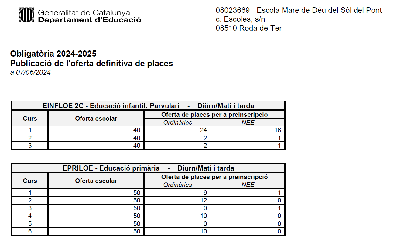 Publicació de l’oferta definitiva de places