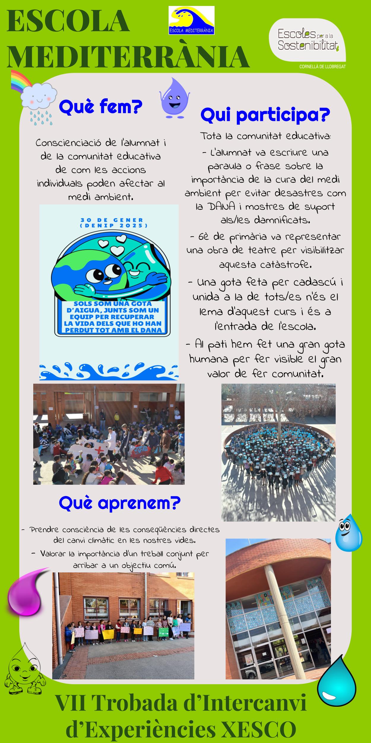 Es va treballar conjuntament i fruït de la reflexió es va fer un dibuix d’ells dins aquesta gota d’aigua. Cada nivell va elaborar una frase i representants de cada classe van llegir-la al pati, des de I3 a 6è de Primària. Així, es va posar en un gran cartolina tot format el gran manifest de l’escola. Després, cicle superior va fer una obra de teatre representant aquesta situació, proposant respostes. A la portada de l’escola hi ha l’aportació simbòlica de cadascú en forma de gota, que junts som la gran mar de la mediterrània.Posteriorment, al pati (a la zona de l’arbre de la rotonda) vam fer una gota gegant entre tothom perquè es veiés el resultat d’aquesta reflexió, un desastre natural pot destruir cases i vides com una guerra. Un sol no pot, però amb la força de tots units podem arribar més lluny. El voluntariat del Dana va portar l’esperança als pobles.