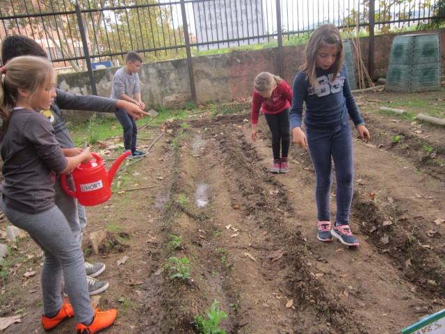Primer hem tret les fulles i branques que hi havia al nostre tros i després hem regat. També, hem posat una mica d’adob per a que creixin més fortes.