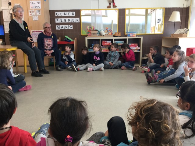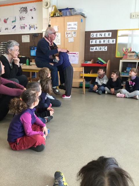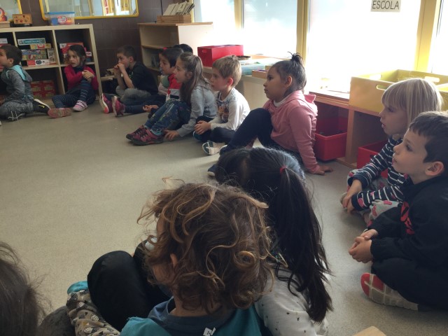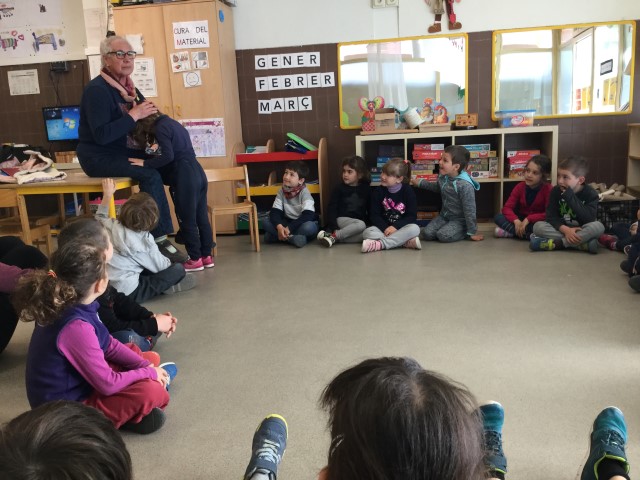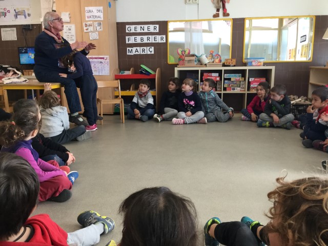 La Maria ens ha fet jocs de falda i moixanes. La Teresa ens ha explicat la història dels Músics de Bremen. Ha estat molt tendre i hem escoltat amb molta atenció.