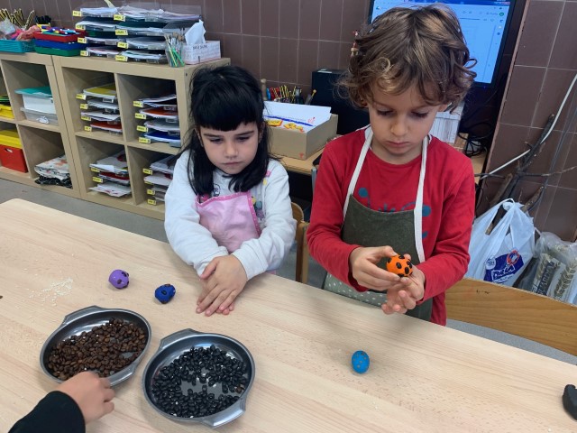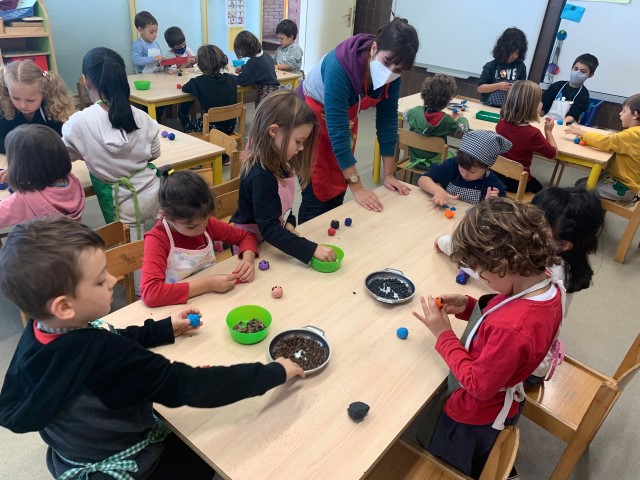 El dijous ben preparats/des amb davantals vam fer panellets de plastilina, que divendres ja estaven llestos per dur-los a casa.