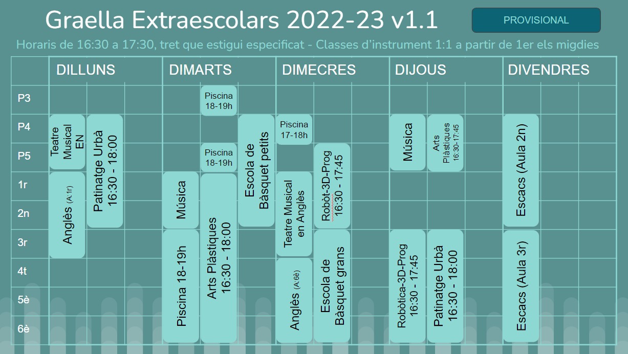 També podeu descarregar-vos la graella provisional amb els horaris previstos per a cada activitat. Aquests horaris i els preus de cada extraescolar es basen en els del curs passat: cal que tots tinguem present que, si no hi ha prou nens i nenes inscrits en alguna activitat, la seva realització no serà possible.