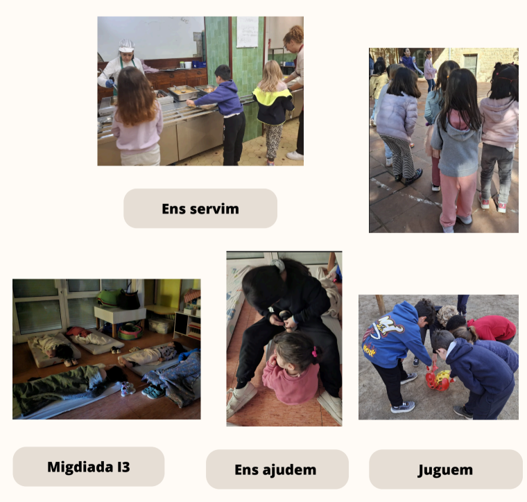 L’espai migdia és de gran importà ncia per fomentar els hà bits saludables, la socialització i la participació en diferents activitats proposades. Apostem pel descans de l’alumnat d’I3, i l’ajuda de l’alumnat més gran alhora de muntar i desmuntar el lloc de descans dels petits.