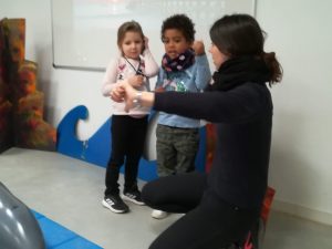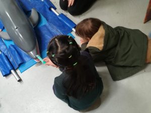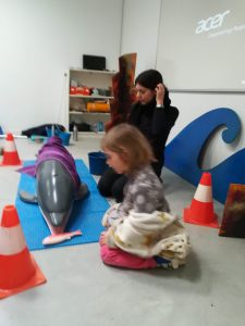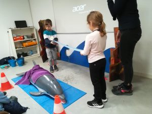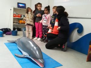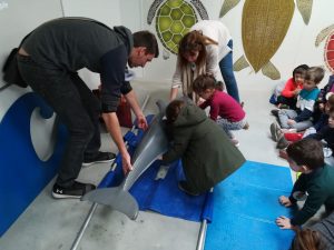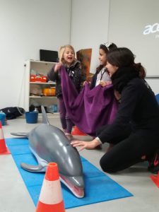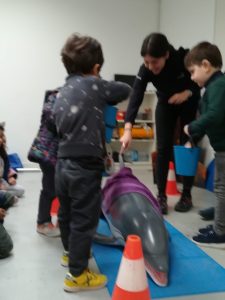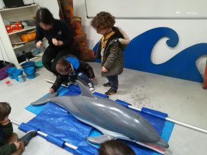 L’Atenea ens ha explicat molt bé què hauríem de fer si ens trobem un animal a la platja. Entre tots hem participat en la simulació del rescat d’un dofí, com si fossin un veritable equip de salvament del CRAM. Dividits en petits grups de banyistes, voluntaris del CRAM i veterinaris tots hem hagut de col·laborar per a salvar el dofí.
