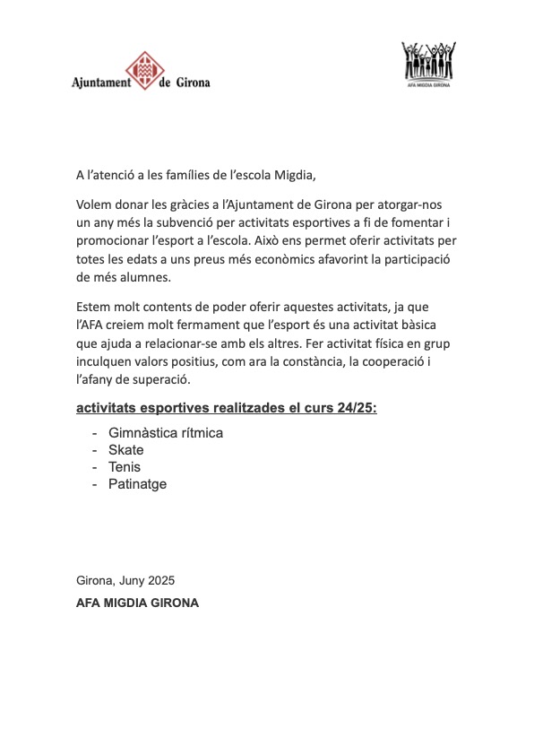 El termini de presentació de les sol·licituds d’ajut individual de menjador escolar per al curs 2025-2026 s’estableix entre el 8 i el 23 de maig de 2025. Ho podeu fer al web del Consell Comarcal: https://www.girones.cat/arees/ensenyament-cultura-turisme-catala-joventut-i-esports/ensenyament/ajuts-de-menjador/ Instruccions de com fer la sol·licitud.