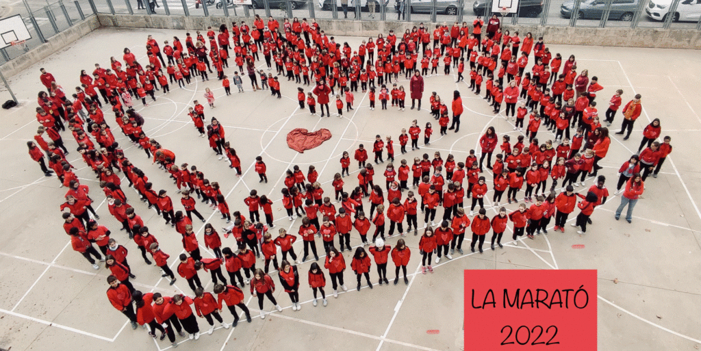Un any més, tota la comunitat educativa hem organitzat diferents actes per a participar a La Marató de TV3, enguany dedicada a la salut cardiovascular. Aquest matí hem realitzat un acte conjunt amb tot l’alumnat de l’escola. Tothom duia penjat al coll un cor amb diferents missatges relacionats amb hàbits saludables. Ens hem col·locat en