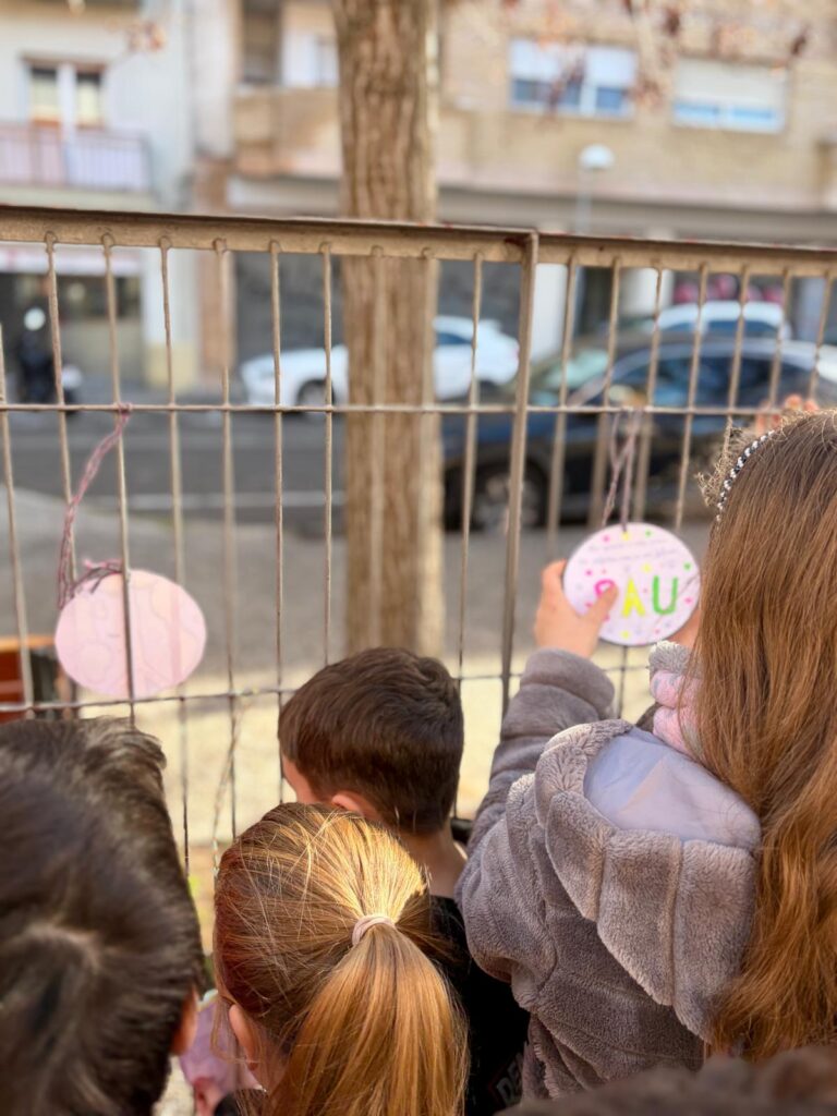 Hem fet una medalla responent a la pregunta del mural ‘Tanca els ulls i pensa en la pau, què veus?’ Quan hem acabat l’acte les hem anat a penjar a l’entrada d’infantil i de primària.