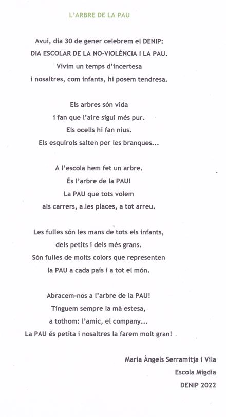 Avui hem celebrat el Dia Escolar de la No-violència i la Pau. Tot l’alumnat ha dibuixat la seva mà en un full de paper , l’ha retallat i després hi ha escrit un missatge per penjar als arbres de la pau d’Educació Infantil i de Primària.