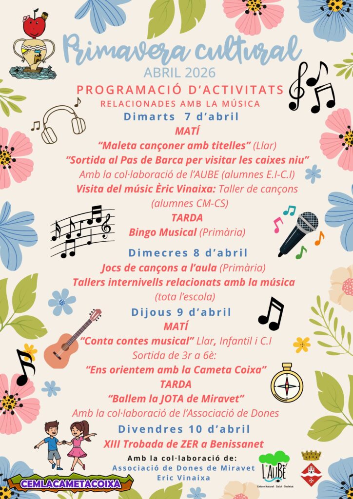 La setmana del 7 al 10 d’abril celebrem la Setmana Cultural, enguany dedicada a la música. Farem diferents activitats per a totes les edats i gaudirem de la col·laboració d’entitats i veïns del poble.
