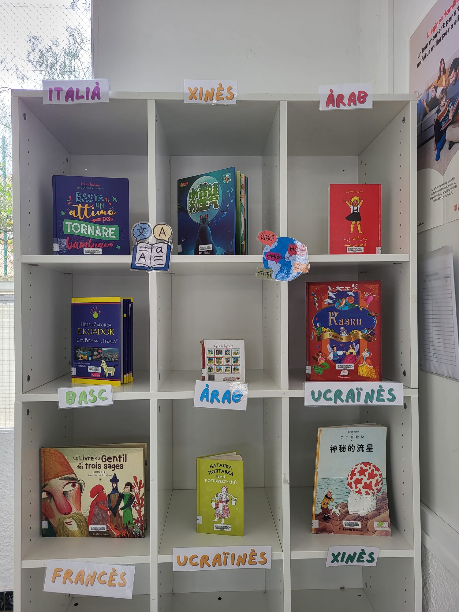 Des de la comissió de biblioteca hem preparat una petita exposició de llibres en diferents llengües presents a la nostra escola: italià, xinès, àrab, basc, francès, ucraïnès…