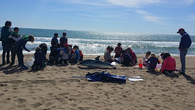 Allà ens van explicar la seva tasca i vam fer un taller per aprendre com es fan els rescats dels dofins que queden varats a la platja.
