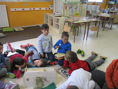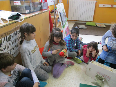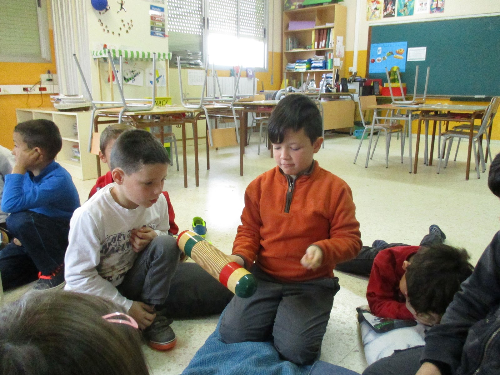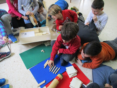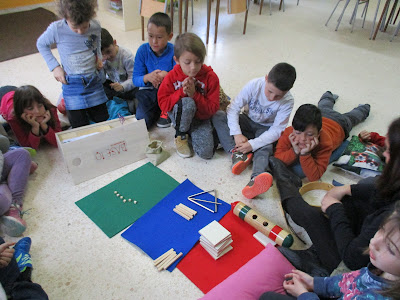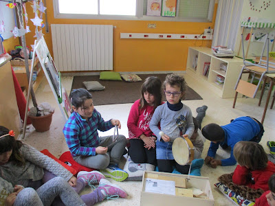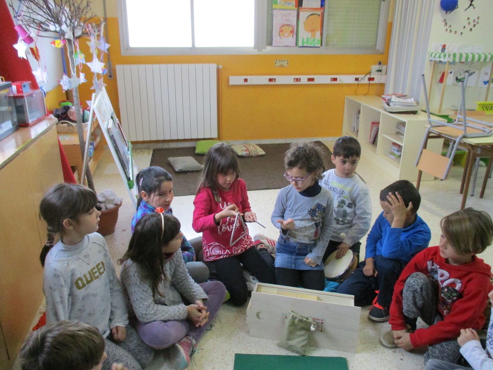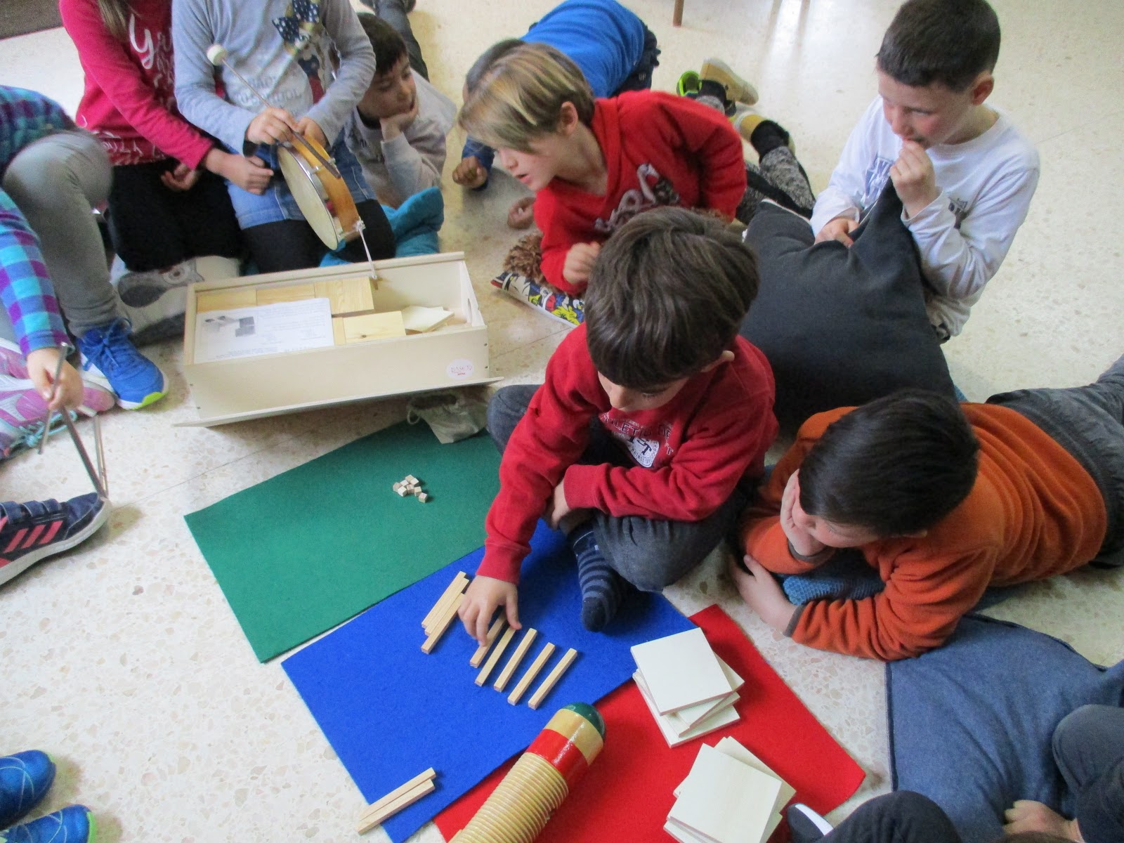 Al 2n trimestre vam fer una classe de matemàtiques, combinant el material base 10 amb instruments musicals. Així, amb 3 instruments de percussió vam representar les unitats, les desenes i les centenes. Ells/es havien de composar un nombre depenent del número de vegades que sonava aquell instrument musical.