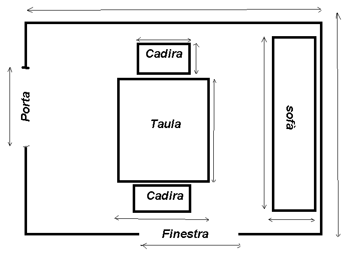 – Volem posar dins una taula quadrada i un sofà. Quan podria mesurar aquesta casa d’ample per ficar una taula, dues cadires com les de classe i un sofà petit de dues places? Penseu abans quant podria mesurar un sofà petit i una taula.